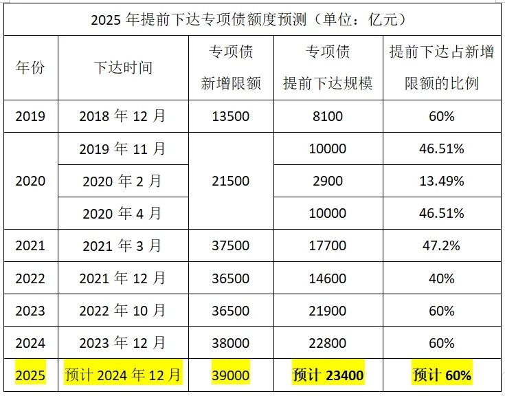 根据往年经验,提前下达额度一般占全年额度的60%,预计2025年新增专项债提前下达规模不会低于2.34万亿。