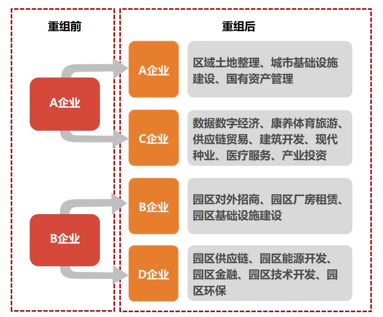 经过与国资中心与企业方的多轮意见征求,重组方案最终确定在区级管理层面形成两家产投公司C、D,分别装入A、B两家集团剥离资产。产投公司C主要由数据数字经济板块、康养体育旅游板块、供应链贸易板块、建筑开发板块、现代种业板块、医疗服务板块与产业投资板块构成,目前重组资产规模约50亿元,目标在2025年底提升至70-100亿元,取得AA等级并于次年发债;产投公司D主要由园区供应链板块、园区能源开发板块、园区金融板块、园区技术开发板块与园区环保板块构成,目前重组资产规模约20亿元,目标在2026年底提升至50-70亿元,取得AA等级并于次年发债。