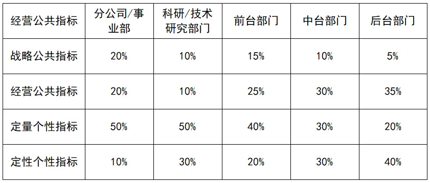 考核指标和权重设置,各个企业之间差异相对较大,但总体导向基本类似。首先,对于中层的管理人员,其工作和公司整体经营业绩表现相对距离较远,隔着一层。因此当然应当以个性指标为主,少承担一些共性指标。其次,对于共性指标,越是市场化程度高的,就越应当强调战略目标的达成;越是市场变化程度低的,就越应当强调和经营结果的绑定。