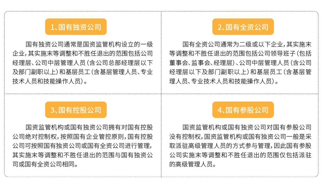 按照以上国有企业的分类和国有企业员工层级划分,不同类别的国企实施末等调整和不胜任退出的范围也有所不同。