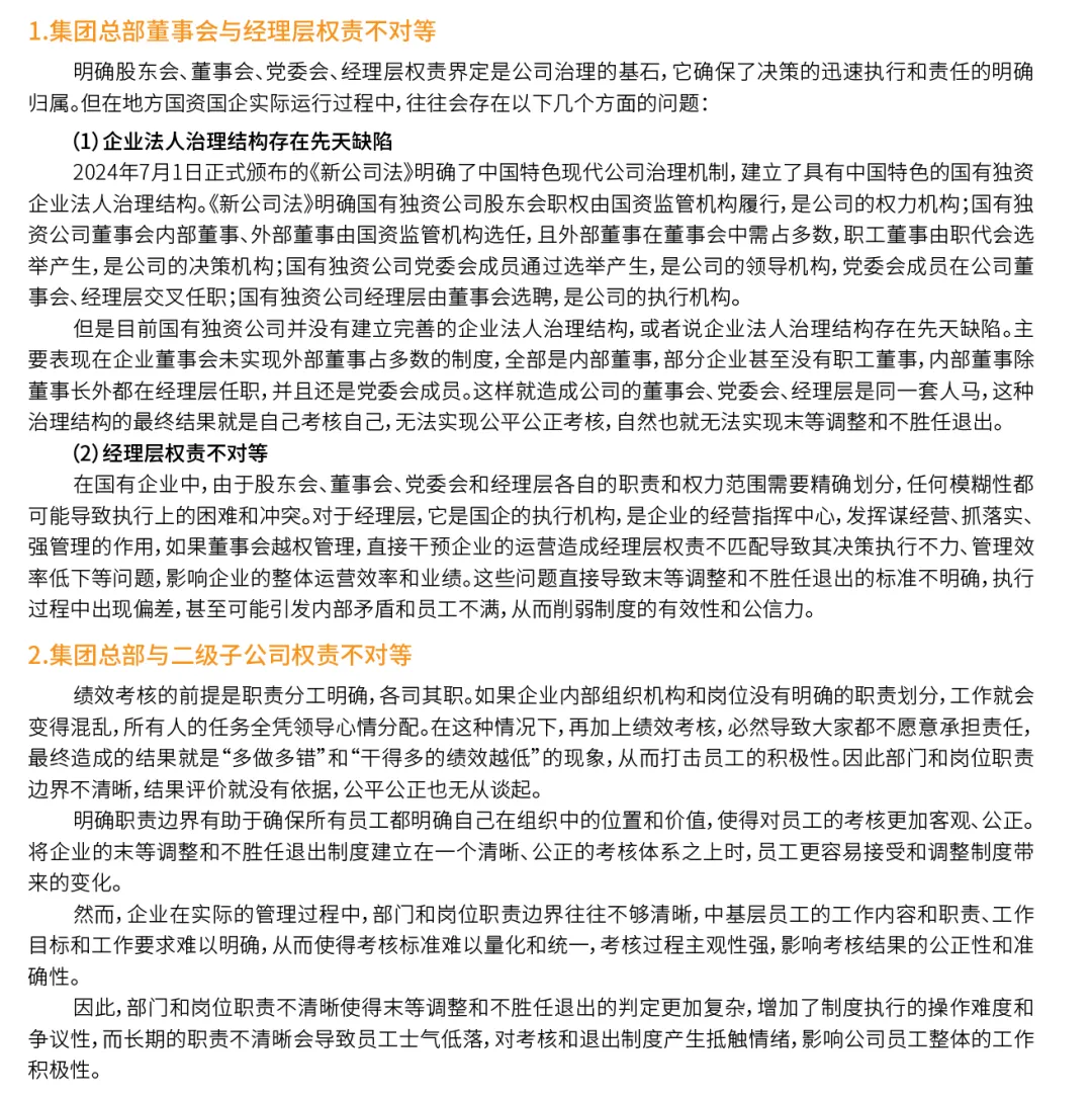 企业治理结构不合理,尤其是经理层权责不对等,不仅影响了企业的管理效率和决策质量,还削弱了激励机制的有效性,从而制约了末等调整和不胜任退出制度的推行。