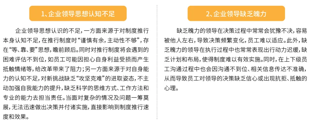 从企业领导人角度来看,企业领导应具备的核心胜任能力包括:能够驾驭复杂局面的领导力、敢于任事担当、勇于开拓创新的能力、处事公平公正、善于团结员工的能力等,但实际工作中,部分领导领导力不足导致制度推进工作较难开展,具体表现在: