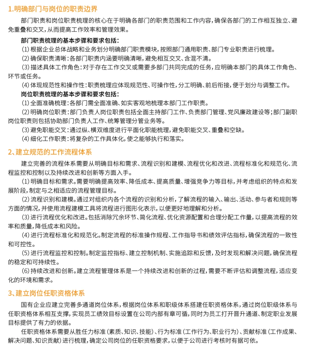 科学规范、清晰明确的组织体系是实现绩效管理的基础。建立科学规范、清晰明确的组织体系需要明确国有企业内设部门和各岗位之间的职责边界,梳理企业各项业务的工作流程,建立企业各岗位的任职资格体系。