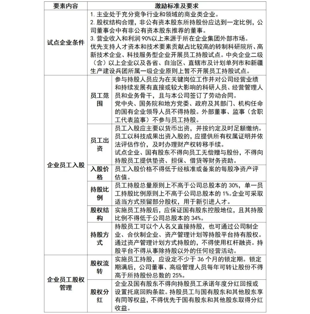 表:国有控股混合所有制企业员工持股标准及要求