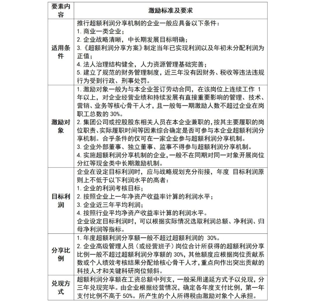 表:超额利润分享机制标准及要求