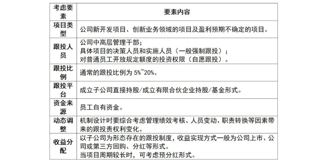 项目跟投是市场化的行为,国有资产流失的风险相对较小,同时员工跟投设计也是一项复杂的工程,不同公司的项目特点、发展阶段、管理架构甚至企业文化不同,都需匹配不同的机制,须量身定做最适合的机制,而在实操过程中需要考虑以下几个方面。