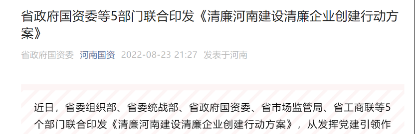 3、河南省委组织部、省委统战部、省国资委等五部委联合印发《清廉河南建设清廉企业创建行动方案》