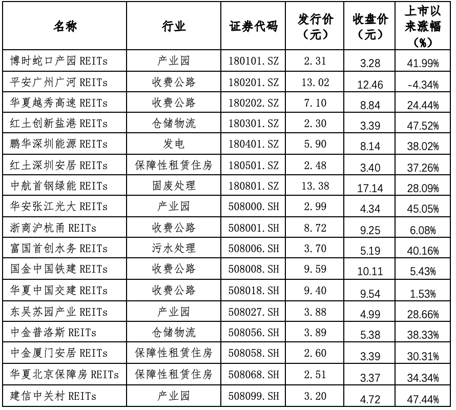 17只公募REITs市场表现(截止9月6日) |