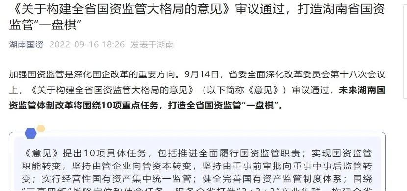 9月14日,省委全面深化改革委员会第十八次会议上,《关于构建全省国资监管大格局的意见》(以下简称《意见》)审议通过,未来湖南国资监管体制改革将围绕10项重点任务,打造全省国资监管“一盘棋”。