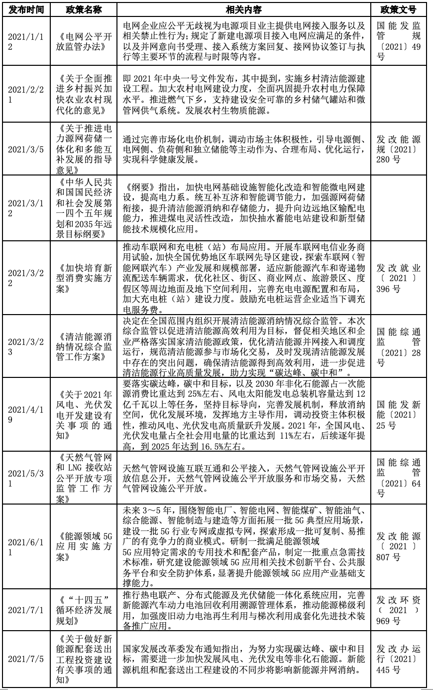 区域能源网络是指除了天然气和集中式发电所提供的热电外,还将太阳能、潮汐能、风能等可再生的清洁能源,以及其它分布式发电的电力都纳入到区域能源网络中来,以形成一个综合性的、多元化的区域能源网,并且现在已经出现了更高阶的“区域能源互联网”形式。早在“九五”规划中,我国就提到了建设联合电网、统一调度,随着基础设施发展以及技术的不断突破,“十三五”规划首次在顶层文件中出现能源互联网,明确建设“源-网-荷-储”协调发展、集成互补的能源互联网,并在2016年的《关于推进“互联网+”智慧能源发展的指导意见》、《关于推进多能互补集成优化示范工程建设的实施意见》等文件,明确将区域能源网作为国家能源互联网综合试点示范的主要形式之一。去年的“十四五”规划中提要加快电网基础设施智能化改造和智能微电网建设,加强源网荷储衔接。