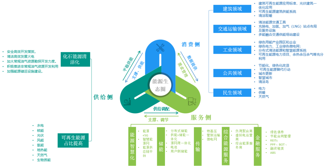 具体来看,能源供应侧主要有煤炭企业、油气企业、天然气供给企业、可再生能源企业,需要关注能源开采、清洁加工转化等环节;能源服务侧有传输企业、综合服务、储存、智慧化改造等企业,关注能源的运输、数字化、存储、金融投资等环节;能源消费侧有工业企业、建筑施工企业、物业公司、交通运输企业和公共机构,主要关注工业生产、城乡建设和居民福祉提升。三大主体最终形成能源生态圈,聚集能源服务商、产业链上下游供应商、终端用户、政府及行业机构、金融及投资机构、科研机构及高校、小微企业和创客等产业相关方,整合能源全产业、全服务、全价值链资源,通过信息技术创新和管理创新、商业模式创新相融合,带动更多市场主体参与能源互联网的价值创造和分享,不断催生新产业新业态新模式,形成互利共赢的能源互联网新生态。