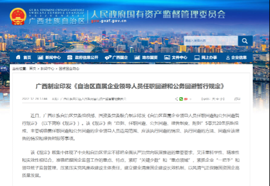 该《规定》由“总则、任职回避、公务回避、报告制度、附则”5章共20条措施组成,主要明确需任职回避和公务回避的企业领导人员适用范围、应该执行回避的情况、执行回避的方法、回避应该报告的情况和报告时限等事项。