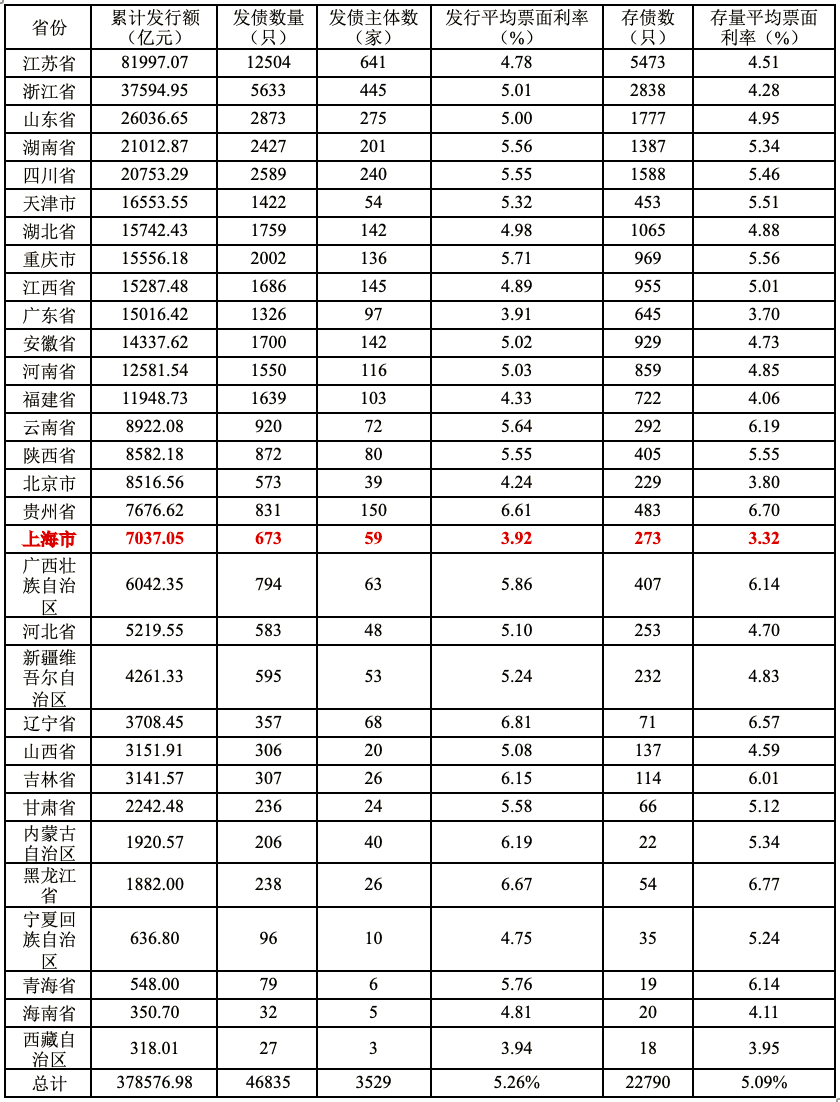上海城投债规模7037.05亿元,居于全国中间位置,发行平均票面利率3.92%,存量平均票面利率3.22%,偿债压力主要集中在2023年和2025年,债务负担相对较轻,且上海市城投企业多数具备自身造血能力,区域再融资能力强,部分区域城投在隐债置换背景下,整体风险较小。此前,上海国资制发了《进一步加强市国资委监管企业境外投资监督管理有关事项的通知》,加强债务风险全生命周期管理,对信用评级低、集中到期债券规模大、现金流紧张、经营严重亏损的企业予以重点关注。同时将359户重点子企业纳入集团风险预警监测范围,构建“1+1+N”风险预警指标体系,构建事前风险指标预测、事中风险边界管控和事后风险应对的闭环式风险预警管理机制。协调解决了上海电气、绿地集团等一批重大风险事项。