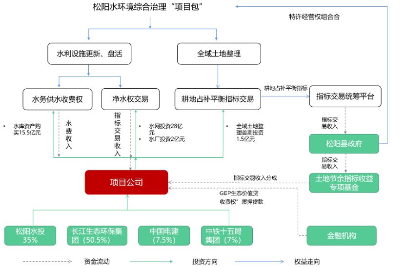 创设特许经营权,将公益性与经营性项目联合立项,将水务基础设施的更新与新建自来水厂、全域土地整理等项目联合打包,组合形成松阳水环境综合治理“项目包”,试行“投、建、营”一体化、统一运作。“项目包”总投资31.5亿元,其中水网投资28亿元、水厂投资2亿元、全域土地整理首期投资1.5亿元(分10个批次滚动开发,年开发规模约1500-2000亩)。松阳水投(35%)与长江生态环保集团(50.5%)、中国电建(7.5%)、中铁十五局集团(7%)组建项目公司运营该项目,引入社会资本投资达17亿元。项目通过创设净水交易和耕地占补平衡指标交易特许经营收入作为投资回报,尤其是全域土地整理方面,可新增耕地面积2万余亩,回报丰厚。在实施过程中松阳县专门设立了土地节余指标收益专项基金,将全域土地整理指标收益作为政府性基金,实行“收支两条线”财政预算管理,确保专款专用。同时,制定《松阳县土地整治项目土地节余指标收益专项资金管理办法》,明确节余指标收益资金使用范围、收付流程等,制度化、规划化保障特许经营项目收入来源稳定。