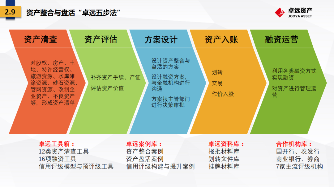 总结盘活存量资产的PPP模式、REITs模式、与改扩建相结合、挖掘低效闲置资产价值、发行资产支持专项计划、产权交易、作价入股、兼并重组等8大路径的实操方法,详细分析13个具体实践案例,指导落地性较强;介绍了南京卓远特创的资产整合与盘活“卓远五步法”:资产清查——资产评估——方案设计——资产入账——融资运营,提高广大城投企业工作效率。