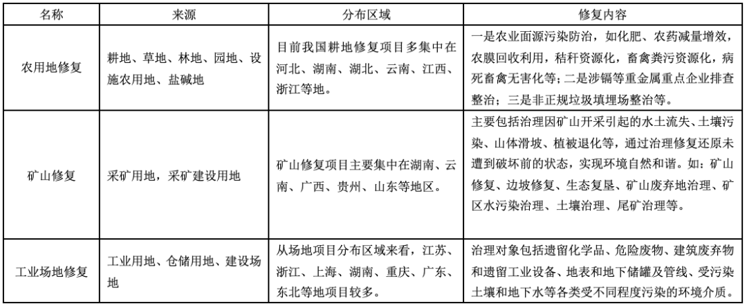 土壤修复是指利用物理、化学、生物等技术手段,转移、吸收、化解土壤中的重金属、塑料、化学等污染物质,使土壤中的污染物降低到可接受的浓度,或使其恢复正常功能。根据土地类型,目前土壤修复领域细分主要有工业场地修复、农业用地修复和矿山修复,现阶段土壤修复集中在工业场地修复和部分农用地修复,修复的支付主体仍以地方政府为主,但随着“修复+土地出让” 1、“修复+土地流转”2 的新模式出现使得支付主体意愿充足,且后期的土地出让或指标交易有力保障了土壤修复的资金需求。