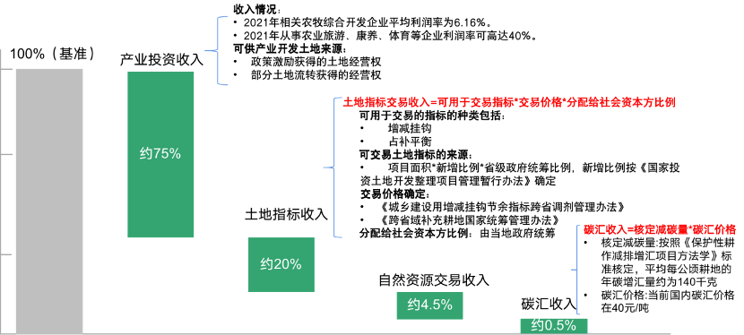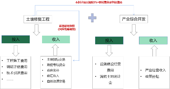 2、项目收入=土地指标交易收入+产业投资投入+修复产生的自然资源交易收入+碳汇收入