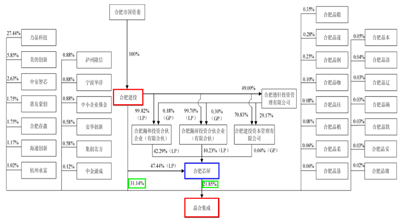 第一阶段:2015年—2018年,成立全资子公司晶合集成,引入晶圆代工生产国际知名企业参股。成立之初,合肥建投全资控股晶合集成,全额认缴了1000万元的注册资本。之后,合肥建投才引入国际知名企业力晶科技,与之签署了《投资参股协议》,约定给予力晶科技在晶合集成中低于50%的股份,要求其投入技术、人才到晶合集成的早期布局中。到2020年第一次增资前,力晶科技的出资比例为41.28%。