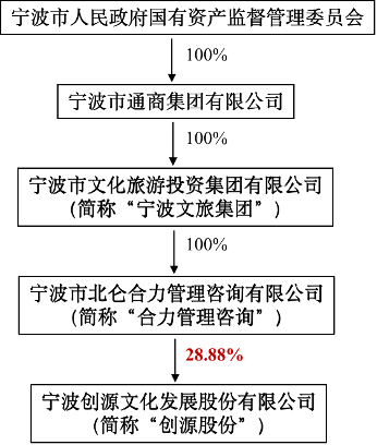 宁波市文化旅游投资集团有限公司(以下简称“宁波文旅集团”)收购了宁波创源文化发展股份有限公司(以下简称“创源股份”)的控股股东宁波市北仑合力管理咨询有限公司(以下简称“合力管理咨询”)100%股权。完成股权交割后,宁波文旅集团通过合力管理咨询间接持有创源股份28.88%的股权,成为创源股份的实际控制人。