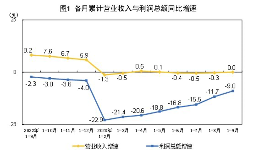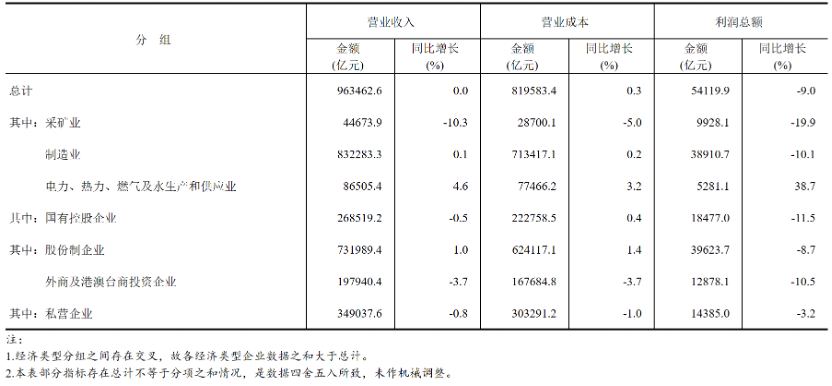 1—9月份,全国规模以上工业企业实现利润总额54119.9亿元,同比下降9.0%,降幅比1—8月份收窄2.7个百分点(按可比口径计算,详见附注二)。