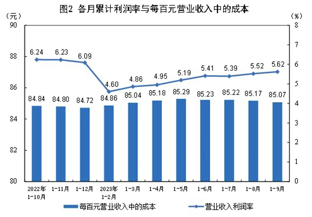 1—9月份,规模以上工业企业实现营业收入96.35万亿元,同比持平;发生营业成本81.96万亿元,增长0.3%;营业收入利润率为5.62%,同比下降0.55个百分点。
