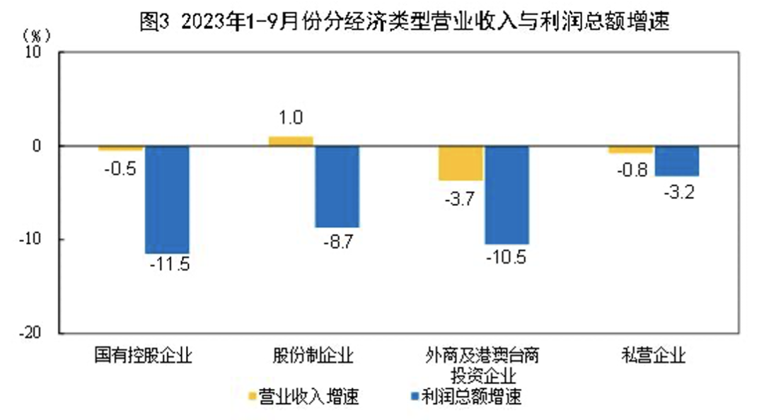 1—9月份,规模以上工业企业中,国有控股企业实现利润总额18477.0亿元,同比下降11.5%;股份制企业实现利润总额39623.7亿元,下降8.7%;外商及港澳台商投资企业实现利润总额12878.1亿元,下降10.5%;私营企业实现利润总额14385.0亿元,下降3.2%。