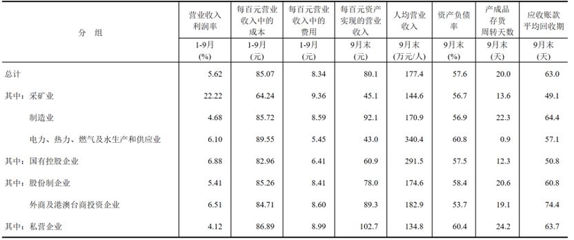 9月末,规模以上工业企业每百元资产实现的营业收入为80.1元,同比减少5.8元;人均营业收入为177.4万元,同比增加6.0万元;产成品存货周转天数为20.0天,同比增加1.2天;应收账款平均回收期为63.0天,同比增加5.9天。