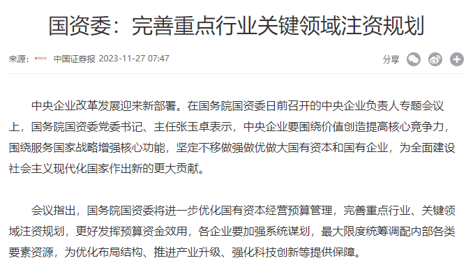 1.中央企业改革发展迎来新部署!国资委召开会议:完善重点行业关键领域注资规划 |