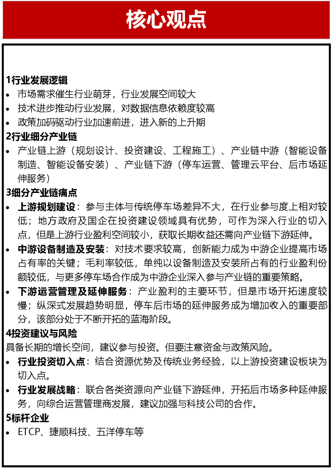智慧停车不仅具有极强的市场需求,同时技术进步的驱动,以及近几年国家、省市政策的加持,给该行业带来了新的发展动力,促使智慧停车进入新的上升期,产业链竞争格局正在从群雄混战的分散局面向头部品牌企业集中,并且联合各类资源向全产业链布局成为相关企业的主要发展趋势。因此,我们认为,该行业具有长期的增长空间。此外,在智慧城市建设背景下,城市级智慧停车成为地方政府解决交通问题、提升城市治理水平的重要方向。我们认为,对于城投企业、尤其是交通类城投企业而言具有参与行业投资的显著优势。