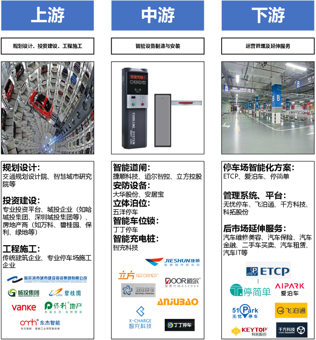 市场主体:参与主体与传统停车场差异不大。在智慧停车场上游主要为停车场规划设计、投资建设、施工等具体环节。其中规划设计即包括对城市或区域内停车场的整体规划,也包含对单个智慧停车场建筑的规划设计。在技术层面上仍以规划设计专业为主,因此参与的企业也与常规停车场规划设计类似,一般为交通类设计院。在投资建设方面,由于涉及到公共区域的智慧停车场属于公共基础设施领域,因此政府或地方国企也是其中的重要参与者,此外对于小区、商业中心等地方主要由房地产开发商参与投资建设。在施工环节除了传统的建筑施工企业之外,还有不少专业的停车场施工企业。