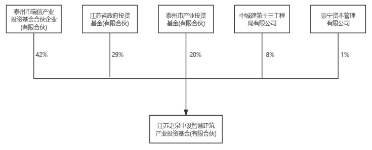 江苏疌泉中设智慧建筑产业投资基金(有限合伙)(简称“疌泉中设建筑基金”)由泰州市瑞信产业投资基金合伙企业(有限合伙)、江苏省政府投资基金(有限合伙)、泰州市产业投资基金(有限合伙)、中城建第十三工程局有限公司以及崇宁资本管理有限公司联合成立,崇宁资本管理有限公司为基金管理人。基金已于2019年9月12日完成了中国证券投资基金业协会产品备案,产品备案编号:SGV352。