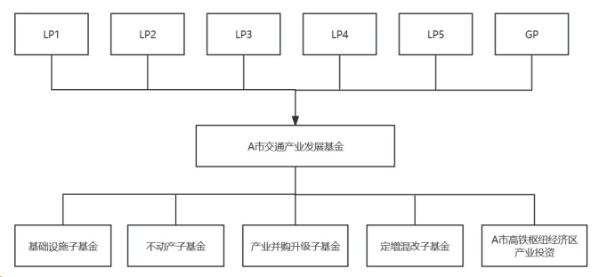 A市交通产业发展基金采用“1+N”的总体架构,即1只母基金、若干支子基金的模式。母基金主要发挥国有资本的引导和带动作用,在子基金层面上进行杠杆放大。设定不同子基金的投资方向,按照市场化原则进行运作。基金存续期暂定15年,总规模100亿元,首期50亿元。