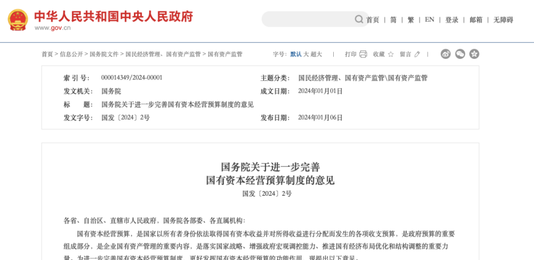 1.国资委发布《关于进一步完善国有资本经营预算制度的意见》(国发【2024】2号) |