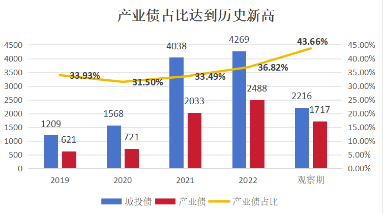 2023年10月至2024年2月5日期间发行的3933只地方国企信用债中,包含1717只产业债和2216只城投债。其中产业债占比达到历史新高43.7%。
