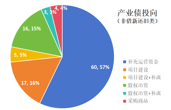 产业债资金也可用于"借新还旧",尤其是通过新发债置换前期间接融资后,能够降低企业融资成本。另外105只非借新还旧类产业债按照资金用途被分为4类:一是60支募集所得的资金拟全部用于“补充运营资金”;二是17支募集所得的资金拟全部用于“项目建设”,5支除“项目建设”外部分用作补流;三是16支募集所得的资金拟全部用于“股权出资”,3支除“股权出资”外部分用作补流;四是4支募集所得的资金拟全部用于“采购商品”。