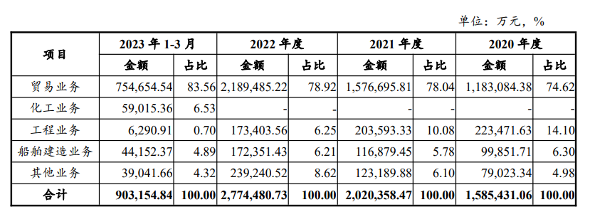 2019年成立当年,青岛经控完成对蓬菜中柏京鲁船业有限公司的收购,布局船舶制造产业。此后2023年2月,青岛经控完成对胜华新材料集团股份有限公司的并表,完成化工产业布局。京鲁船业与胜华新材料均拥有良好的市场化收入与现金流。系列资本运作后,青岛经控主营业务为贸易业务、化工业务、船舶建造业务,工程类业务占比很小。