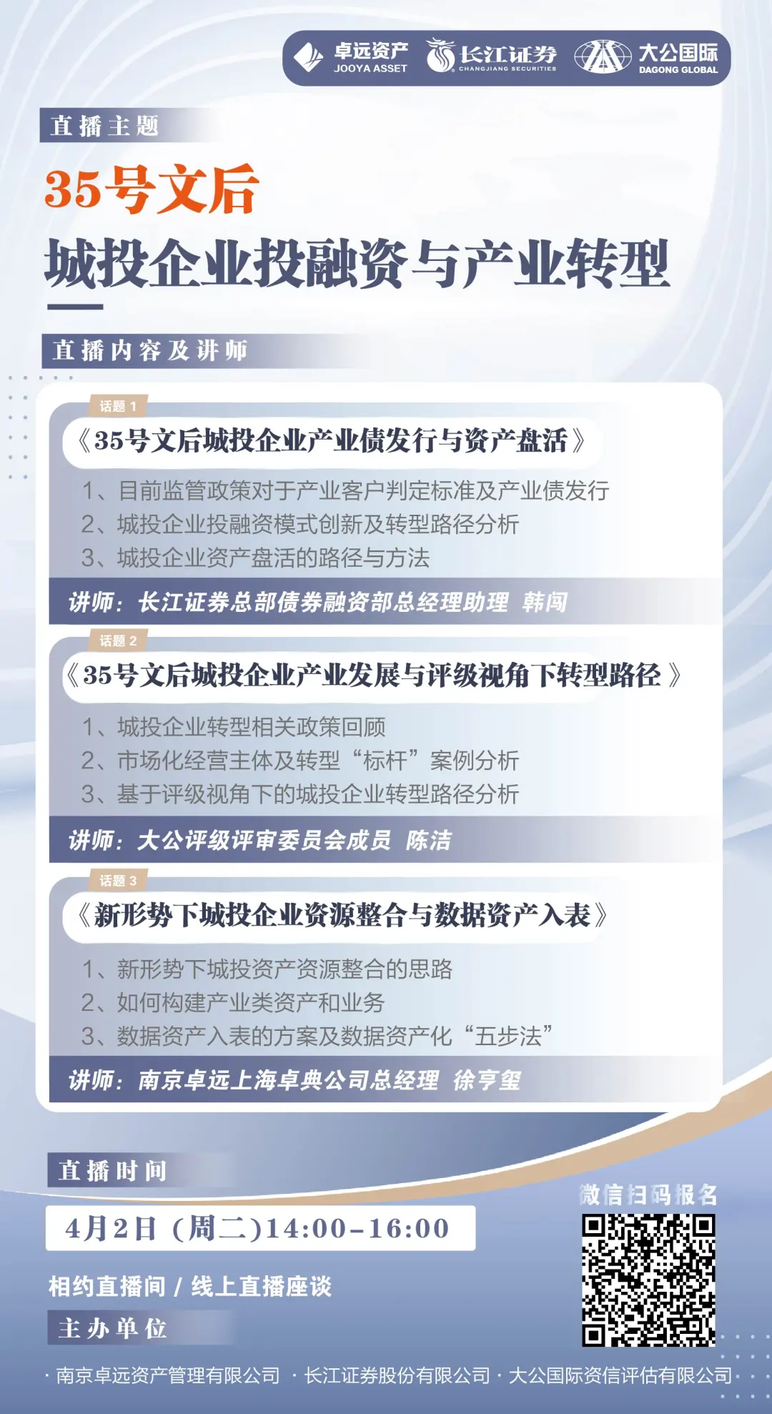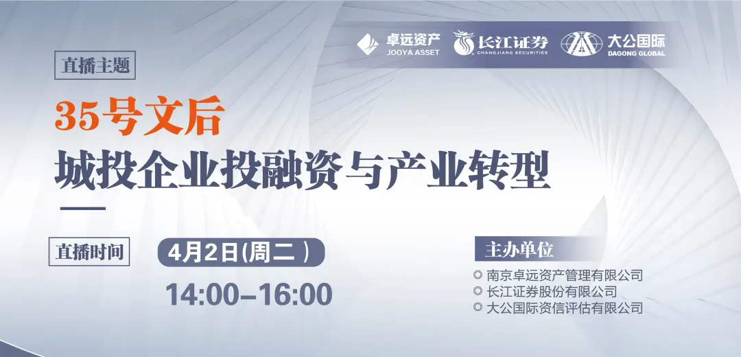 基于此,南京卓远资产管理有限公司联合长江证券股份有限公司、大公国际资信评估有限公司共同推出主题为“35号文后城投企业投融资与产业转型”直播活动,我们将从资源整合并盘活、产业债发行及产业发展、数据资产入表等多个角度切入,以更独特的视野,深度剖析此阶段政策带来影响、目前城投企业转型发展面临的问题,共同探讨城投转型投融资新思路与未来产业发展机遇。欢迎广大城投企业及相关客户朋友参与直播活动,聆听专家授课。