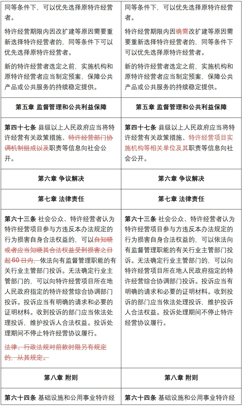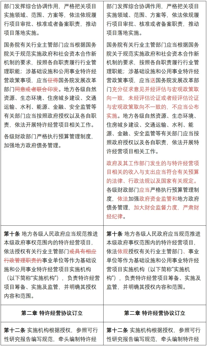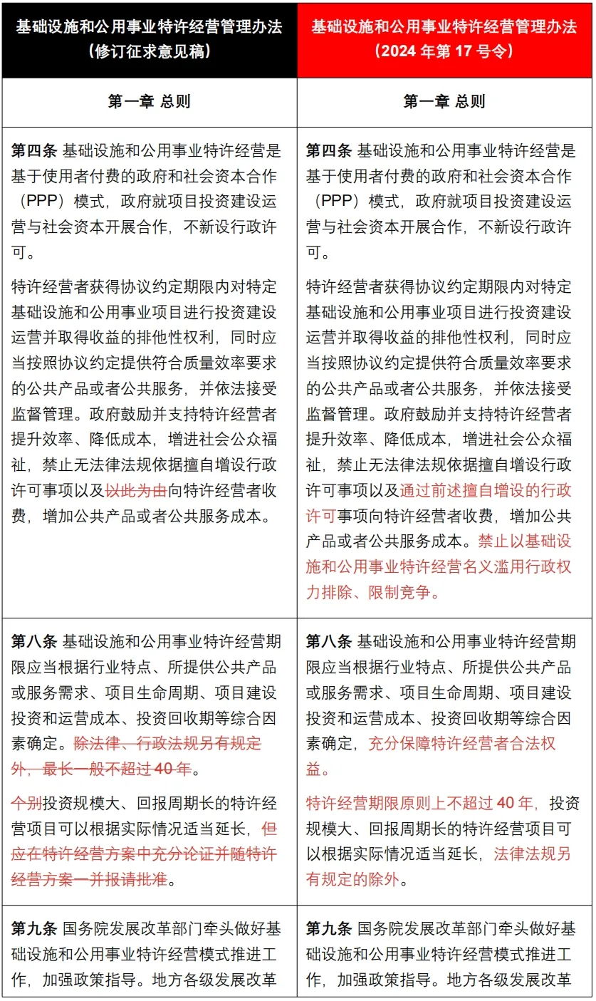 《管理办法》是对2023年11月28日国家发展改革委官方发布的《基础设施和公用事业特许经营管理办法》(征求意见稿)的修订完善,南京卓远整理了《管理办法》与《征求意见稿》的对比版本,以供快速浏览把握修订要点。