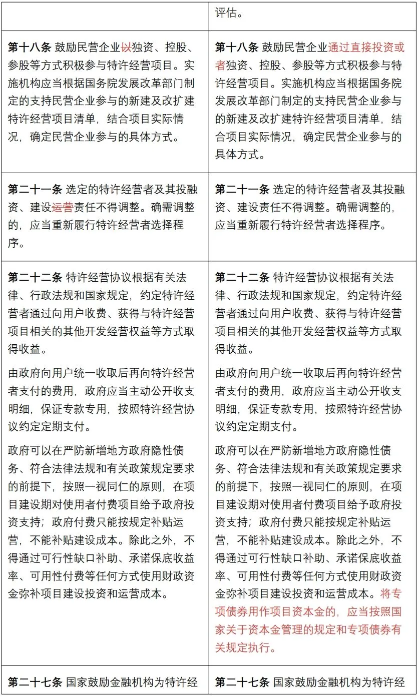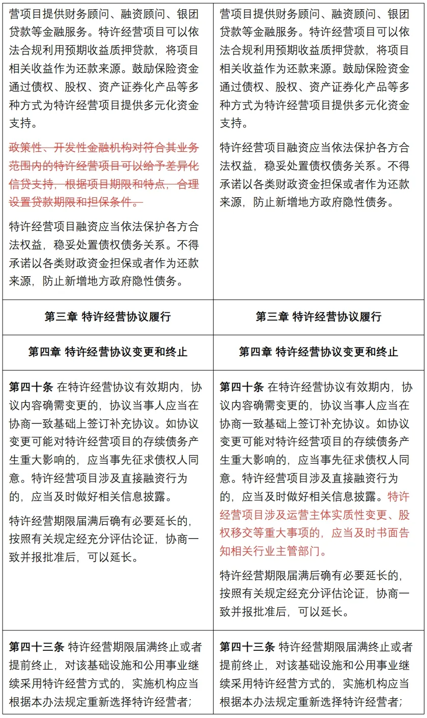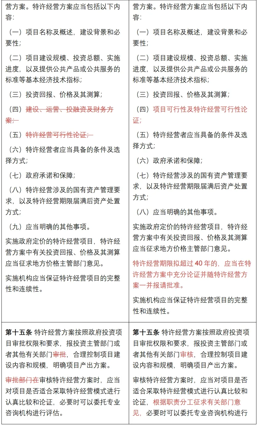 《管理办法》是对2023年11月28日国家发展改革委官方发布的《基础设施和公用事业特许经营管理办法》(征求意见稿)的修订完善,南京卓远整理了《管理办法》与《征求意见稿》的对比版本,以供快速浏览把握修订要点。