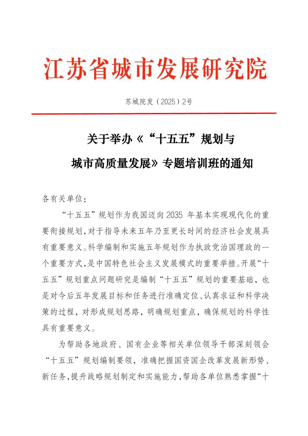 “十五五”规划作为我国迈向2035 年基本实现现代化的重要衔接规划,其对于指导未来五年乃至更长时间的经济社会发展具有重要意义。为帮助各地政府、国有企业等相关单位领导干部深刻领会“十五五”规划编制要领,准确把握国资国企改革发展新形势、新任务,提升战略规划制定和实施能力,帮助各单位熟悉掌握“十五五”规划咨询与研究及编制方法,确保高标准完成各地、各行业“十五五”规划编制工作,进一步推动当地经济社会与城市高质量发展,江苏省城市发展研究院联合南京卓远资产管理有限公司举办本次培训班。