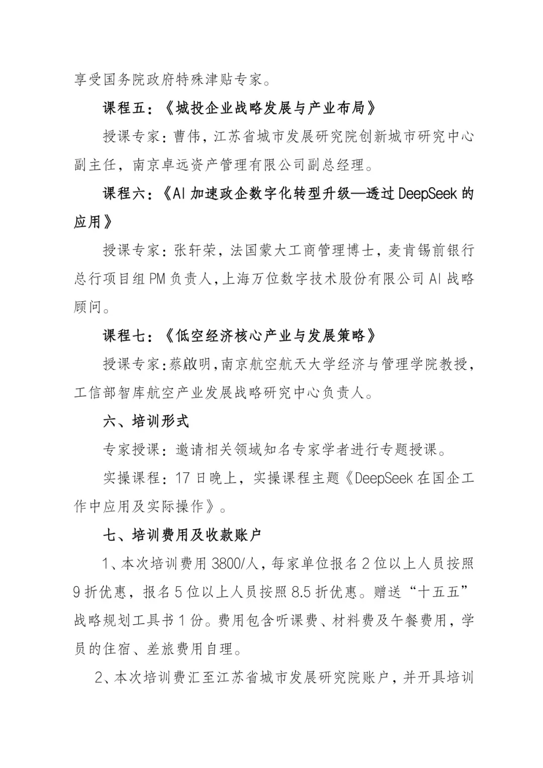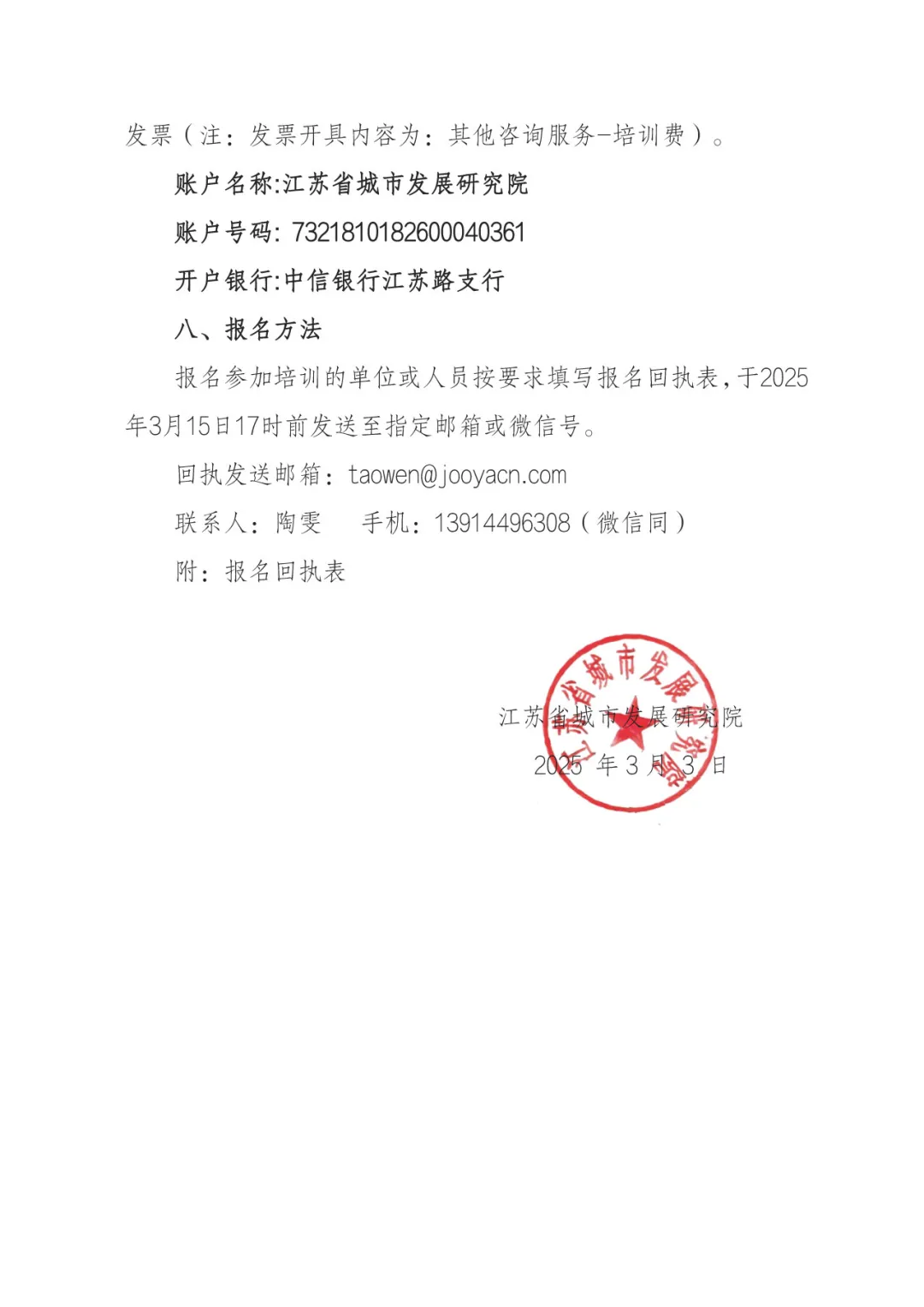 2、本次培训费汇至江苏省城市发展研究院账户,并开具培训发票(注:发票开具内容为:咨询服务-培训费)。