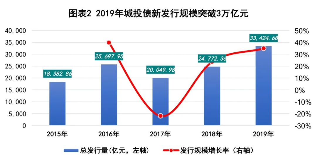 总体来看,在政府隐性债务风险管控持续加码、城投企业还本付息压力持续加重、存量和新建基础设施和公共服务项目建设资金需求增大等内外部多重背景叠加下,2019年度城投债发行规模首次突破3万亿元,达到33424.68亿元,比历史最高年度(2016年)发行规模增加7,726.73亿元。