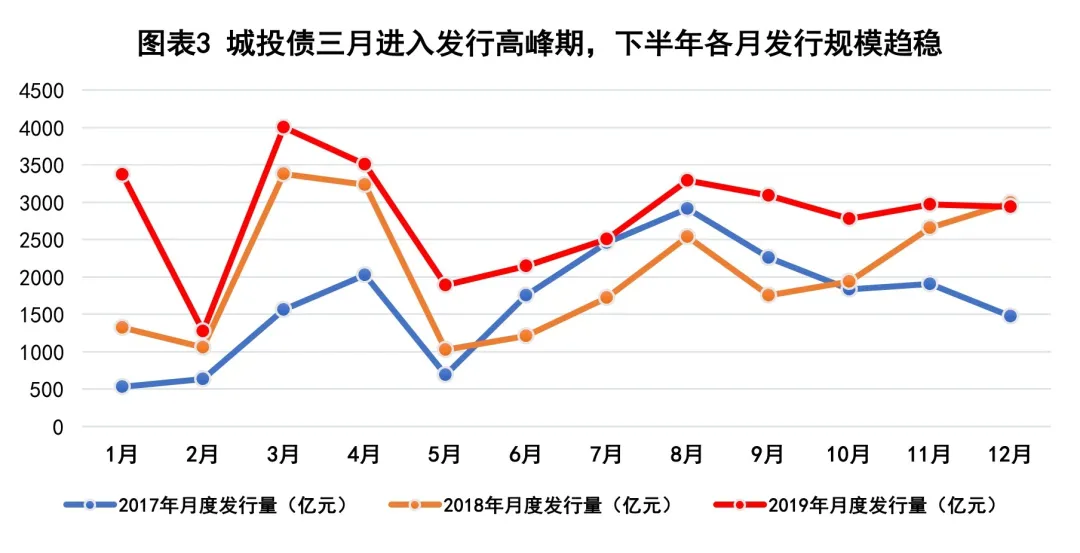 按月度发行情况看,相比于前两年发行情况,2019年度城投债各月度发行规模均呈现增长态势。2019年度发行债券发行高峰出现在三月和四月,其中三月单月发行规模突破4000亿元;下半年发行规模趋于平稳,8月至12月发行规模均维持在3000亿元左右。