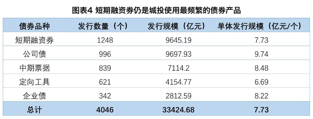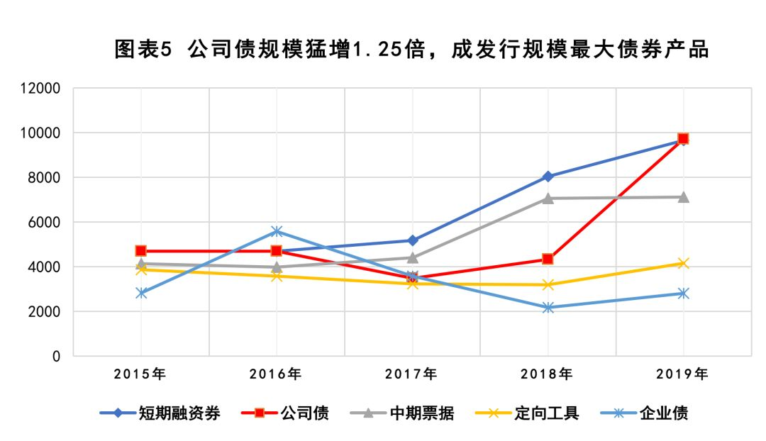 按债券类型来看,2019年度短期融资券、公司债和中期票据三大类债券品种占据新发行城投债总体规模的79.16%。其中,公司债发行规模比上年度增长了1.25倍,超过短期融资券成为2019年度发行规模最大的债券品种,短期融资券仍是城投使用最频繁的债券产品。