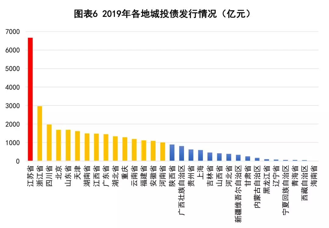 从发行区域来看,2019年度15个地区所在城投新发行城投债规模超千亿。具体来看,江苏省城投债发行规模最大,达6659.02亿元,超过发行规模不足千亿的16个区域的发行规模总和(5331.65亿元),占全国城投债发行总体规模的五分之一。此外,浙江、四川、北京、山东、天津、湖南、江西、广东、湖北、重庆、云南、福建、安徽、河南等14个地区2019年城投债发行规模也超过1000亿元。