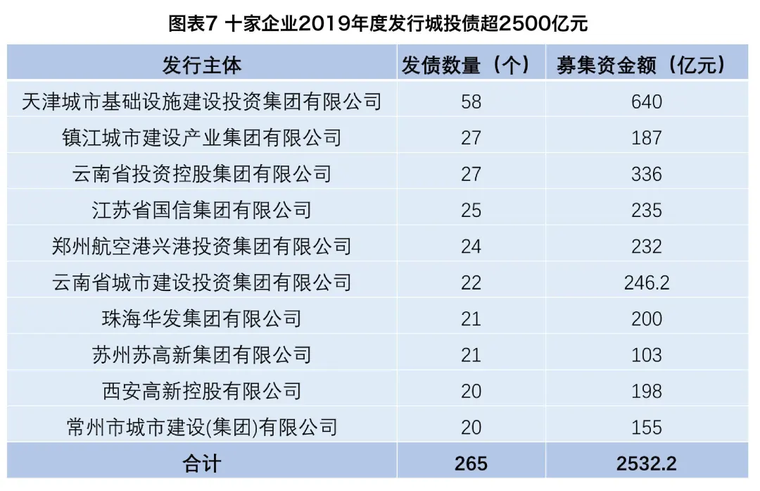 从发行主体来看,截至2019年12月31日,全国处于债券存续期的城投企业共2218家,其中1309家企业在2019年度发行城投债,占比为59.02%。364家企业年度发行债券数量超过3个(不含3),42家企业年度发行债券数量超过10个(不含10),10家企业年度发展债券数量在20个以上(含20个)。