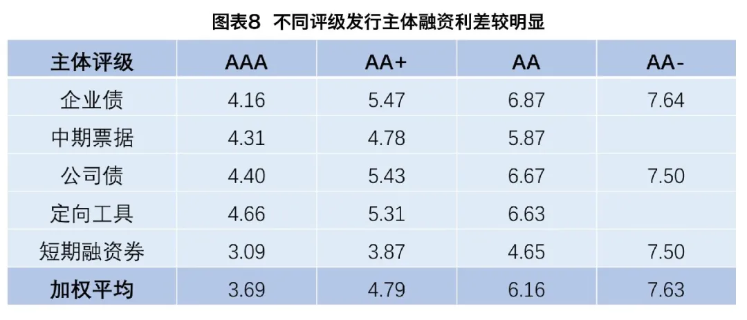 从主体评级来看,2019年度城投债发行主体评级以AA(655家)和AA+(399家)为主,两类主体合计占比为81.45%。不同主体评级间城投债利差较为明显,AAA级与AA+发行主体在融资成本上优势较明显。其中AAA级发行主体2019年度加权融资成本仅为3.69%。