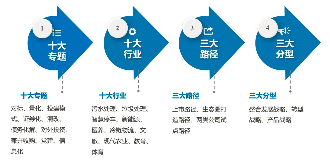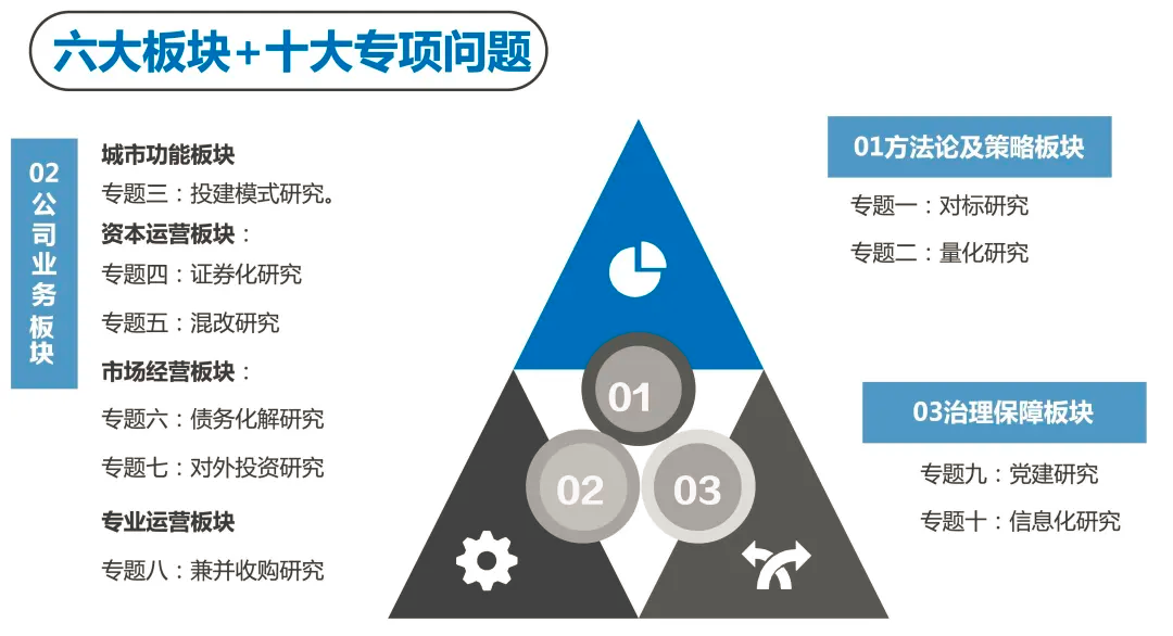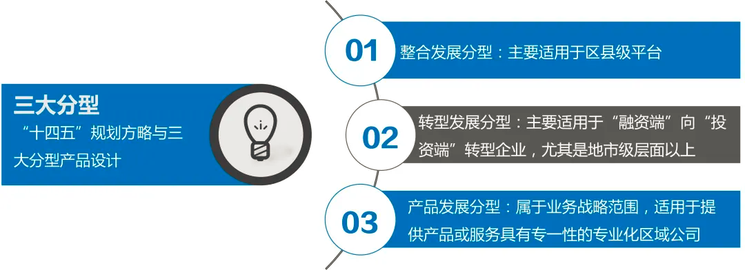3大分型:是“十四五”规划的策略,也是城投公司推进规划实施的制胜之道,以“一企一策”“因企施策”为原则,从整合发展分型、转型发展分型、产品发展分型三个层面展开,以其为城投公司定制规划模式,走上精致发展之路。