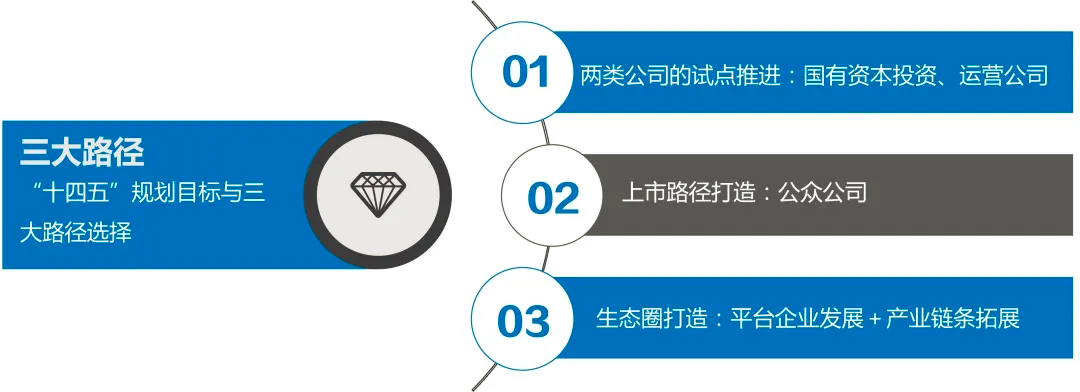 3大路径:是“十四五”规划的目标,也是城投公司推进规划实施的关键路径,从“上市”、“两类公司”、“生态圈”三个层面展开,以期为城投公司的转型空间提供可行性探讨。