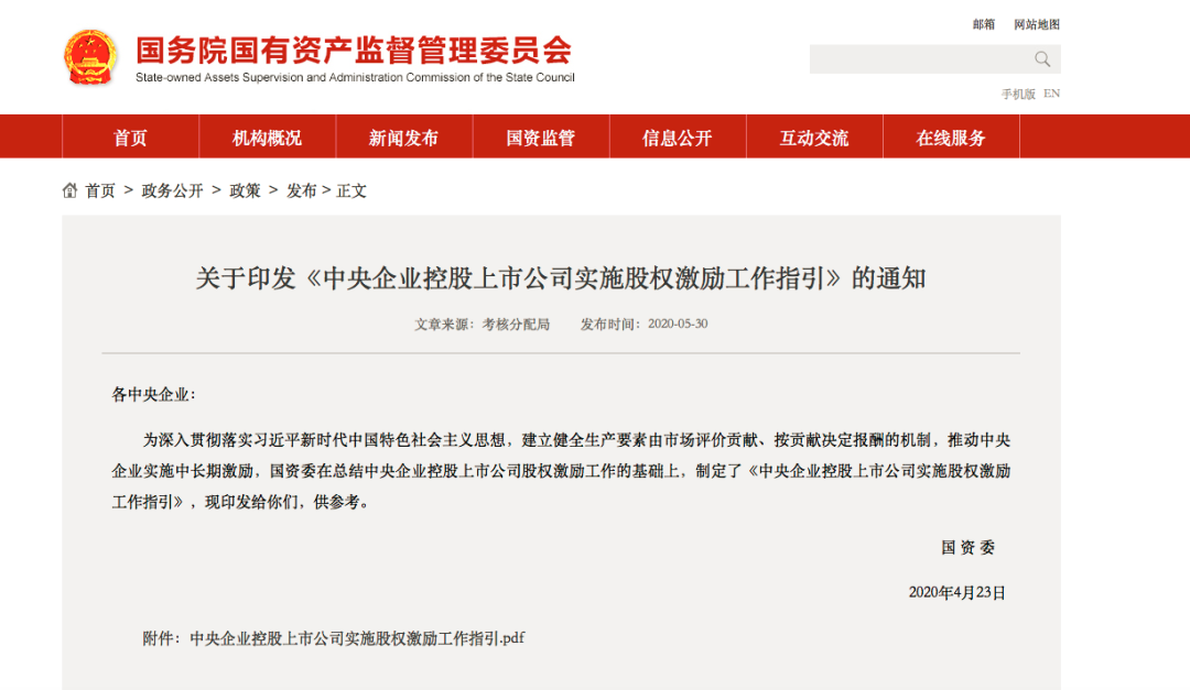 1、国资委关于印发《中央企业控股上市公司实施股权激励工作指引》的通知
